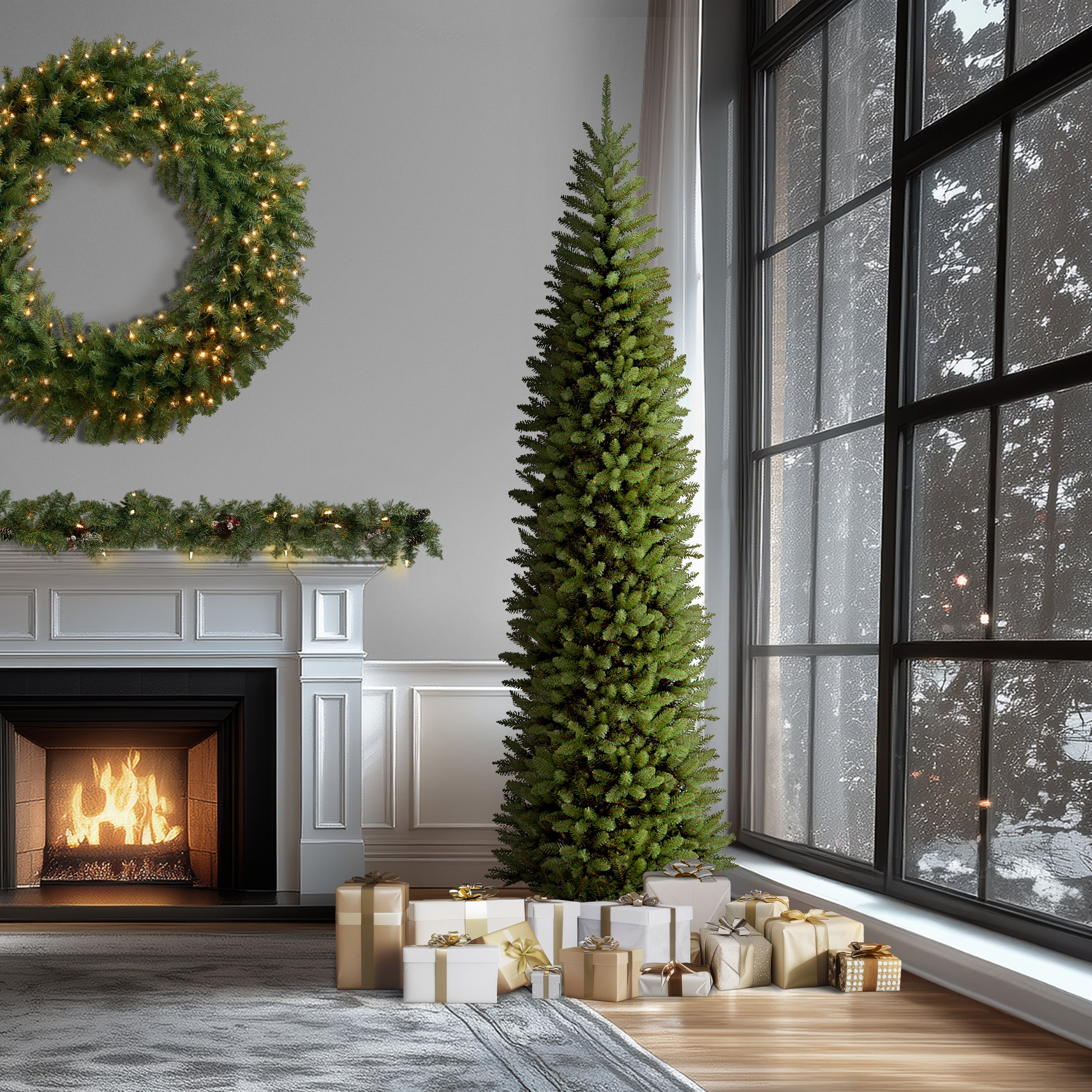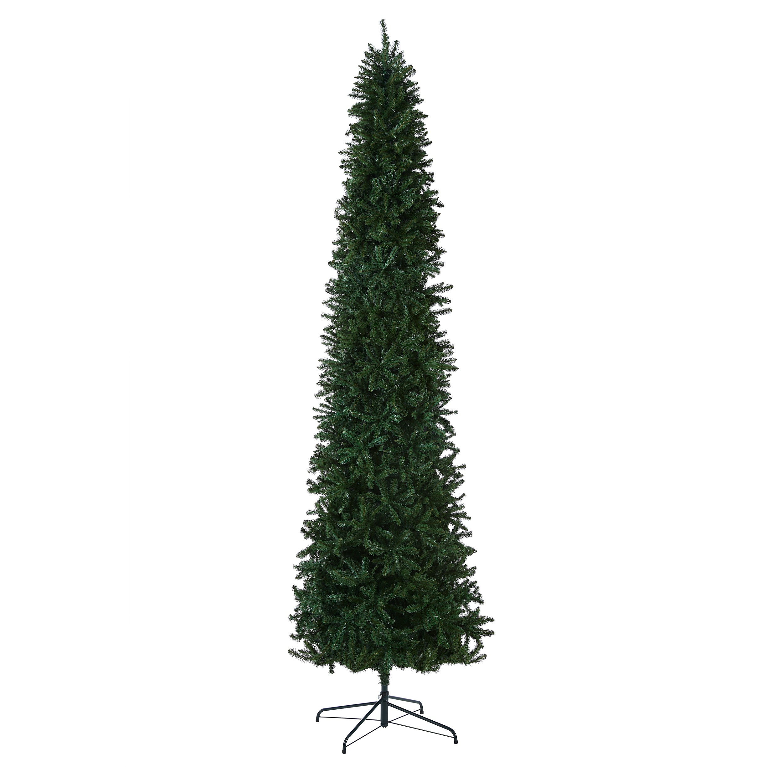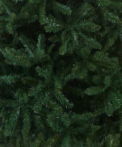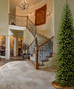 Though tall in height. this Kingswood Fir tree has a pencil thin profile that may make it better for display in corners or areas with limited floor space. compared to typical full width trees of similar height. This tree features hinged branch construction for ease of assembly. Sturdy metal tree stand is included.