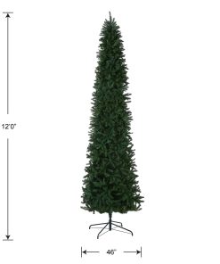- This Kingswood Fir Slim Artificial Green Christmas Tree is 12 feet tall with a 46 inch base diameter. Featuring hundreds of individually crafted branch tips to create full bodied branches. this tree is designed to look and feel lifelike.