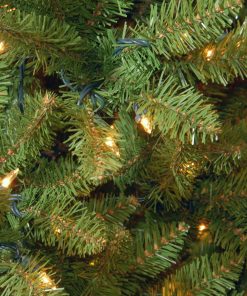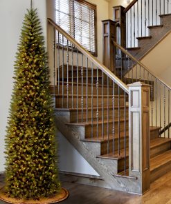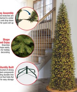 Though tall in height. this Kingswood Fir tree offers has a pencil thin profile that may make it better for display in corners or areas with limited floor space. compared to typical full trees of similar height. It is pre-strung with 800 clear lights that remain lit even if a bulb burns out. This tree features hinged branch construction for ease of assembly. Sturdy metal tree stand is included.