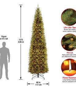 - This Kingswood Fir Slim Pre-Lit Artificial Green Christmas Tree is 12 feet tall with a 46 inch base diameter. Featuring hundreds of individually crafted branch tips to create full bodied branches. this tree is designed to look and feel lifelike.
