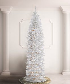 The Kingswood Fir White pencil slim tree is an attractive alternative to the traditional green holiday tree. The pencil thin profile makes it a great choice for display in corners or areas with limited floor space. but high ceilings! It is pre-strung with 800 clear lights that remain lit even if a bulb burns out. This tree features hinged branch construction for ease of assembly. Sturdy metal tree stand is included.