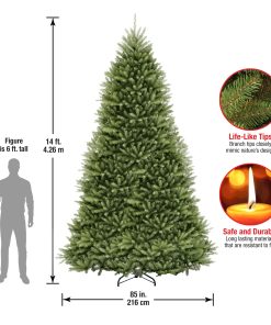 - This Dunhill FirFull Artificial Green Christmas Tree is 14 feet tall with a 85 inch base diameter. Featuring hundreds of individually crafted branch tips to create full bodied branches. this tree is designed to look and feel lifelike.