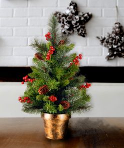 At only 2 feet tall. the Crestwood Spruce Tree is great for tabletop display or for adding holiday cheer to children’s or secondary rooms. Trimmed with silver glitter bristle. pine cones. and red berries and is seated in a gold rubbed planter’s pot. Display this attractive holiday trimming in indoor or outdoor locations.