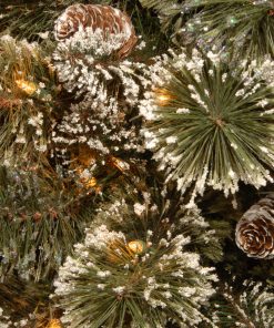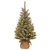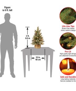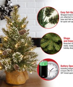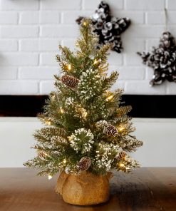 This Glittery Bristle Pine tabletop tree will add a colorful accent to your holiday decorating scheme. Seated in a rustic burlap bag with red bow. this pine tree features white-tipped pine cones and glittered branches. It is pre-strung with 15 battery operated warm white low-voltage LED lights that are energy-efficient. long lasting and cool to the touch. A convenient 6 hours ON/18 hours OFF timer controls light operation.