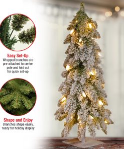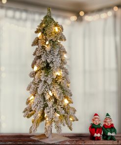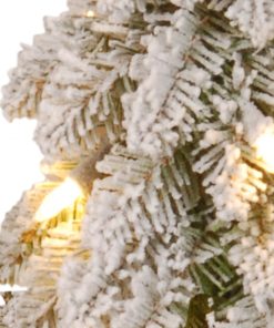 The Snowy Downswept Forestree is a slim profile tree with a downswept branch design and sturdy steel plate base. Branches. pole and base are sprinkled with flocking for the appearance of freshly fallen snow. This tree is pre-strung with 50 clear lights that remain lit even if a bulb burns out. Display this attractive evergreen in indoor or covered outdoor locations.