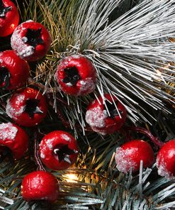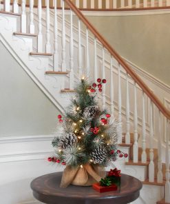 This Snowy Glacier Pine is great for tabletop display or for adding holiday cheer to children’s or secondary room. It is seated in a burlap bag base and features snow sprinkled branch tips trimmed with pine cones and clusters of red berries. This tabletop tree is pre-lit with 35 warm white battery operated LED lights with an integrated 6 hours ON/18 hours OFF lights timer included. For indoor display.