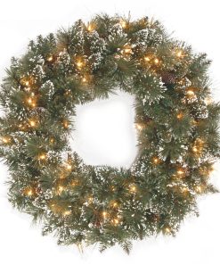 - Designed with a Glittery Bristle Pine branch base. this pre-lit artificial Christmas wreath is 24 inches wide and decorated with pine cones and frosted branches.