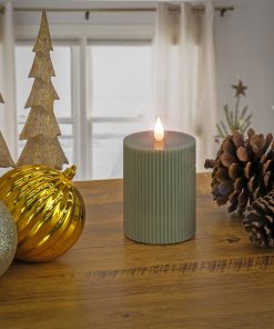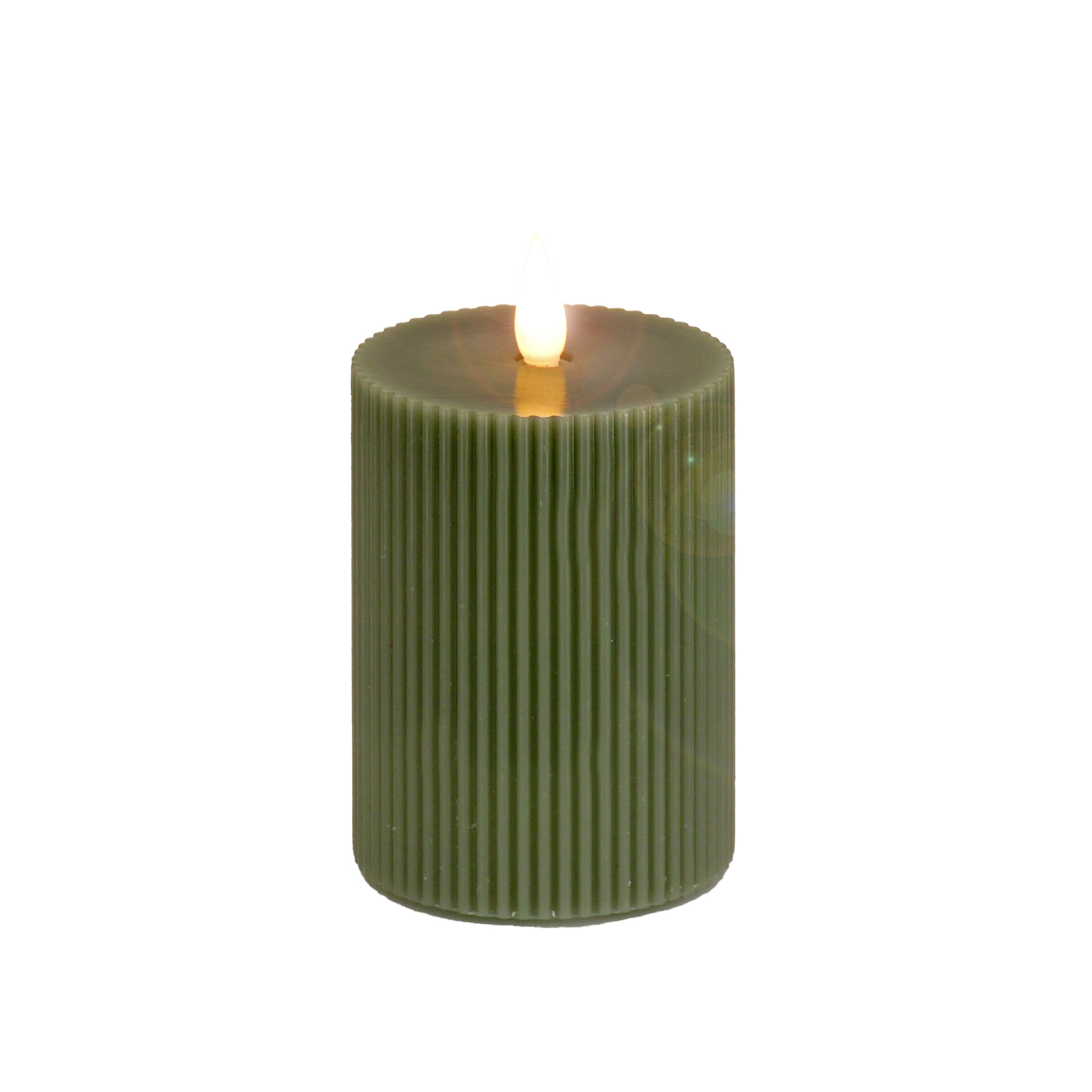 Battery operated with remote controlled functions. this flameless candle produces a realistic. soft. and safe candle glow. The exterior surface is crafted with real wax and features an elegant vertical ridged design in an attractive dark green finish. A handheld remote control operates the lifelike candle flame with functions that include brightness. flicker speed. and timer settings. Uses two C size batteries (not included).