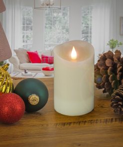 Battery operated with remote controlled functions. this flameless candle produces a realistic. soft. and safe candle glow. The smooth. ivory color exterior surface is crafted with real wax and features an uneven ‘melted’ top appearance. A handheld remote control operates the lifelike candle flame with functions that include brightness. flicker speed. and timer settings. Uses two C size batteries (not included).