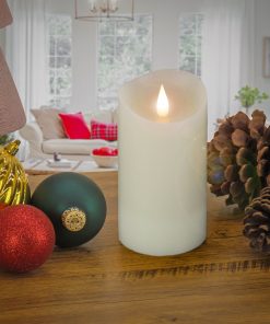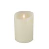 Battery operated with remote controlled functions. this flameless candle produces a realistic. soft. and safe candle glow. The smooth. ivory color exterior surface is crafted with real wax and features an uneven ‘melted’ top appearance. A handheld remote control operates the lifelike candle flame with functions that include brightness. flicker speed. and timer settings. Uses two C size batteries (not included).