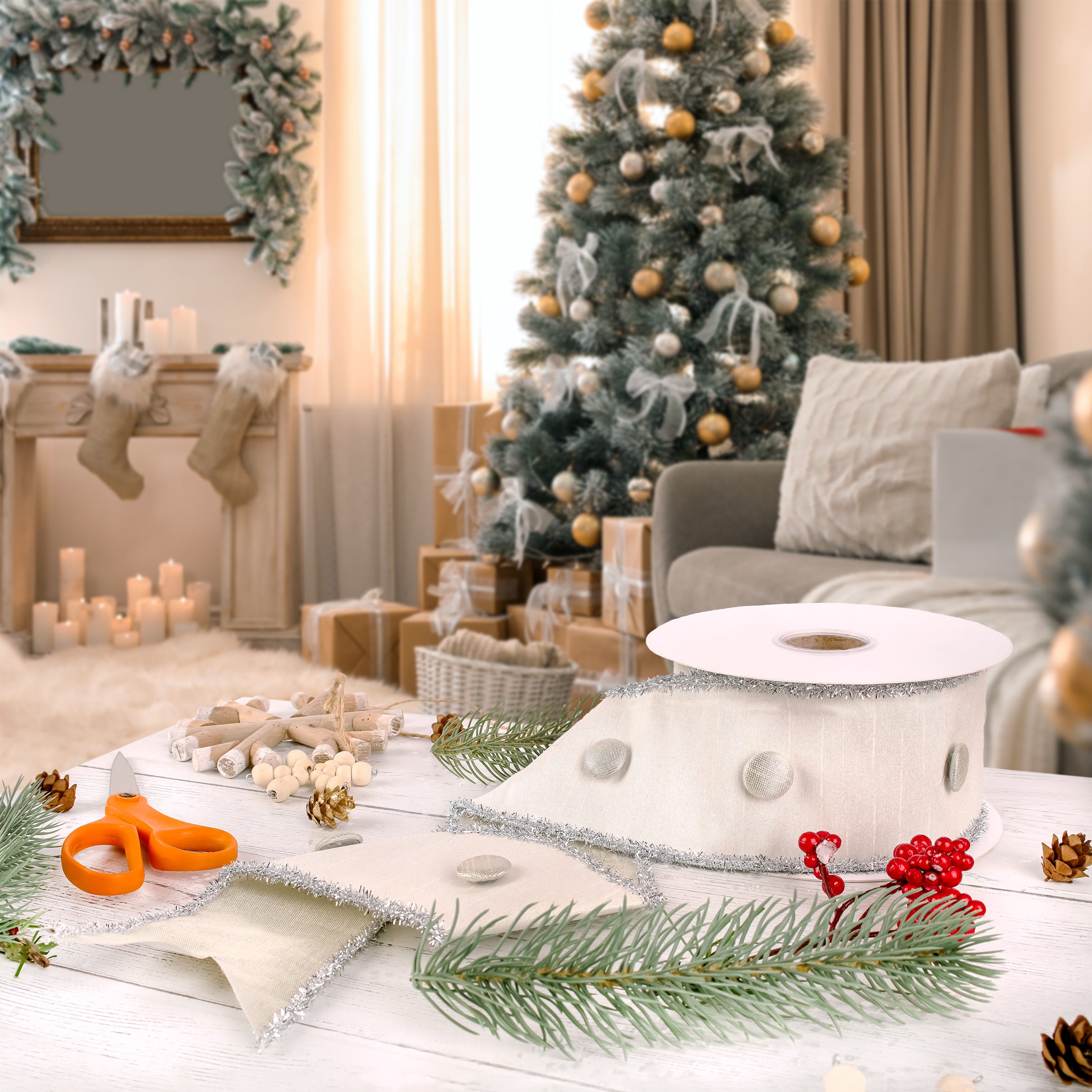The HGTV Home Collection by National Tree Company 3 inch dupioni white button ribbon with silver tinsel piping is delightful! Its unique button texture combined with the shimmer of silver tinsel makes it a versatile choice for various crafts and decor.
