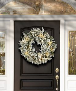 This snow-dusted Frosted Colonial Fir wreath features Feel Real branch tip technology. creating a decoration with remarkable realism. This mixed tip wreath is trimmed with golden poinsettia flowers and snow covered berry clusters. It is pre- lit with 400 Dual Color LED Cosmic Lights which are micro LED bulbs pre-lit at 4-times the volume found on wreaths of comparable size. The integrated Dual Color system features a choice of ten different warm white and multicolor light functions. This wreath can be displayed on doors. walls and windows in indoor or covered outdoor locations.