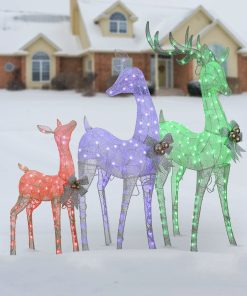This set of three deer includes Buck. Doe and Fawn are constructed of strong braided acrylic mesh that is sprinkled with glitter and wrapped around a sturdy wire frame. Each has a silver ribbon bow with ball ornaments as an attractive embellishment. They are lit with a combined total of 340 multicolor LED lights. A handheld remote is included to control light functions. For indoor or outdoor display. Ground stakes are included.