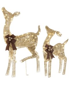 These Fawn and Doe figures are made with rigid sisal material wrapped around a wire frame creating a strong and durable holiday trimming. The champagne color adds a touch of sophistication and glamour to your decor.They are pre-lit with a total of 105 warm white LED lights that make this decoration sparkle and shine. Each figure features a ribbon and bow embellishment. Display this in indoor or outdoor locations.