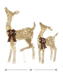 - Includes one 38 inches in height champagne gold Doe. and 28 inches in height Fawn with ribbon and ornaments. To power the lights. simply plug in to the nearest wall outlet