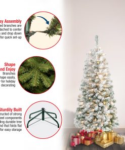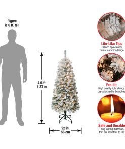 The Acacia tree offers a slim profile tree that is great for display in corners. small rooms and areas with limited space. This tree features flocked branches giving the appearance of freshly fallen snow. It ispre-lit with 100 clear lights that remain lit even if a bulb burns out. This tree features hinged branches for ease of assembly. Sturdy folding metal tree stand is included.