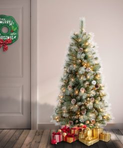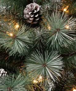 The Perry Hard Needle tree features a mix of snow-dusted evergreen and bristle branch tips. Trimmed with snow dusted pine cones. it is pre-lit with 150 clear lights that remain lit even if a bulb burns out. Crafted with high quality materials and hinged branches for easy set up and includes a sturdy metal folding stand. For indoor display only.