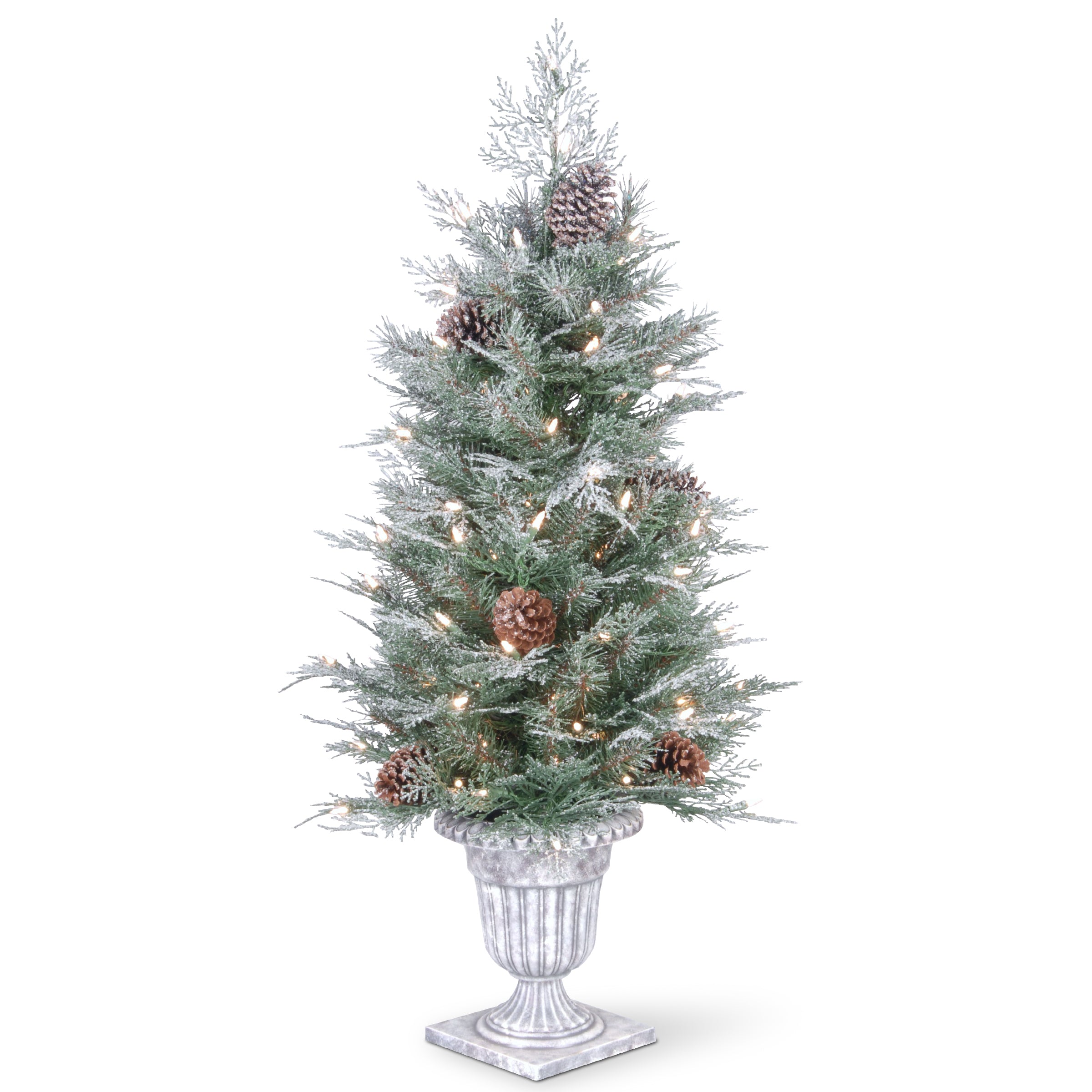 The Frosted Mountain Spruce Entrance Tree features Feel Real branch tip technology. ensuring stunning realism with its crush-resistant branch tips molded from actual tree branches. This mixed-tip design combines lush greenery with a frosted finish. creating an inviting and festive look. It is pre-lit with 100 clear lights that remin lit even if a bulb burns out. Trimmed with pine cones and seated in a pedestal urn base. this entrance tree is perfect for welcoming guests during the holiday season. Fo rindoor or outdoor display.