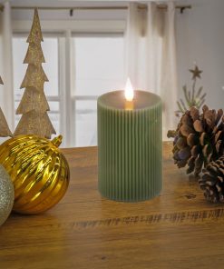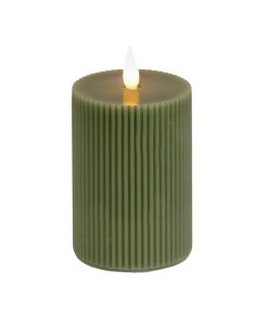 Battery operated with remote controlled functions. this flameless candle produces a realistic. soft. and safe candle glow. The exterior surface is crafted with real wax and features an elegant vertical ridged design in an attractive dark green finish. A handheld remote control operates the lifelike candle flame with functions that include brightness. flicker speed. and timer settings. Uses two C size batteries (not included).