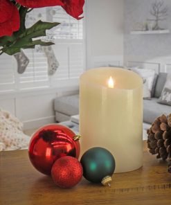 Battery operated with remote controlled functions. this flameless candle produces a realistic. soft. and safe candle glow. The smooth. ivory color exterior surface is crafted with real wax and features an uneven ‘melted’ top appearance. A handheld remote control operates the lifelike candle flame with functions that include brightness. flicker speed. and timer settings. Uses two C size batteries (not included).
