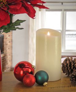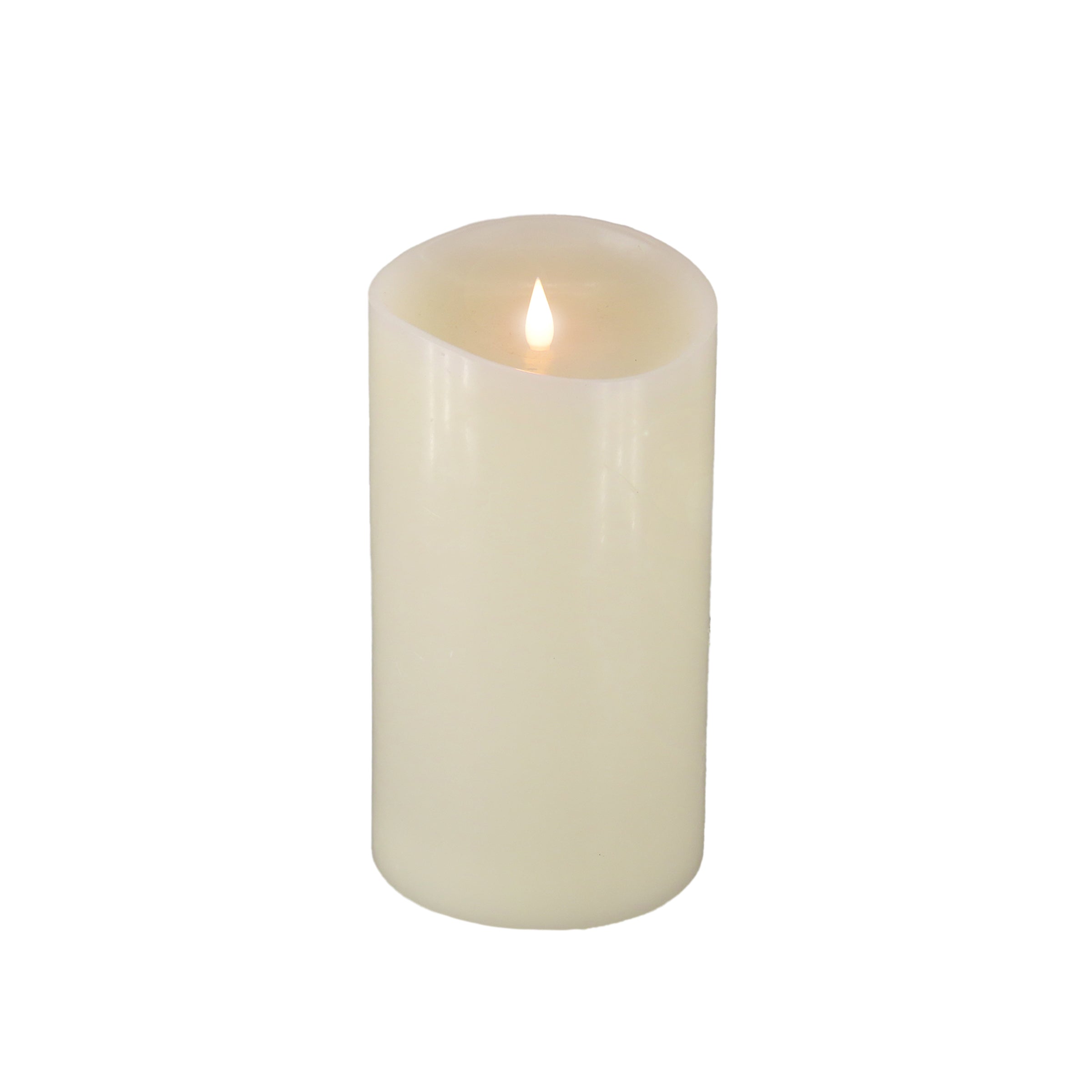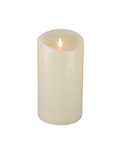 Battery operated with remote controlled functions. this flameless candle produces a realistic. soft. and safe candle glow. The smooth. ivory color exterior surface is crafted with real wax and features an uneven ‘melted’ top appearance. A handheld remote control operates the lifelike candle flame with functions that include brightness. flicker speed. and timer settings. Uses two C size batteries (not included).