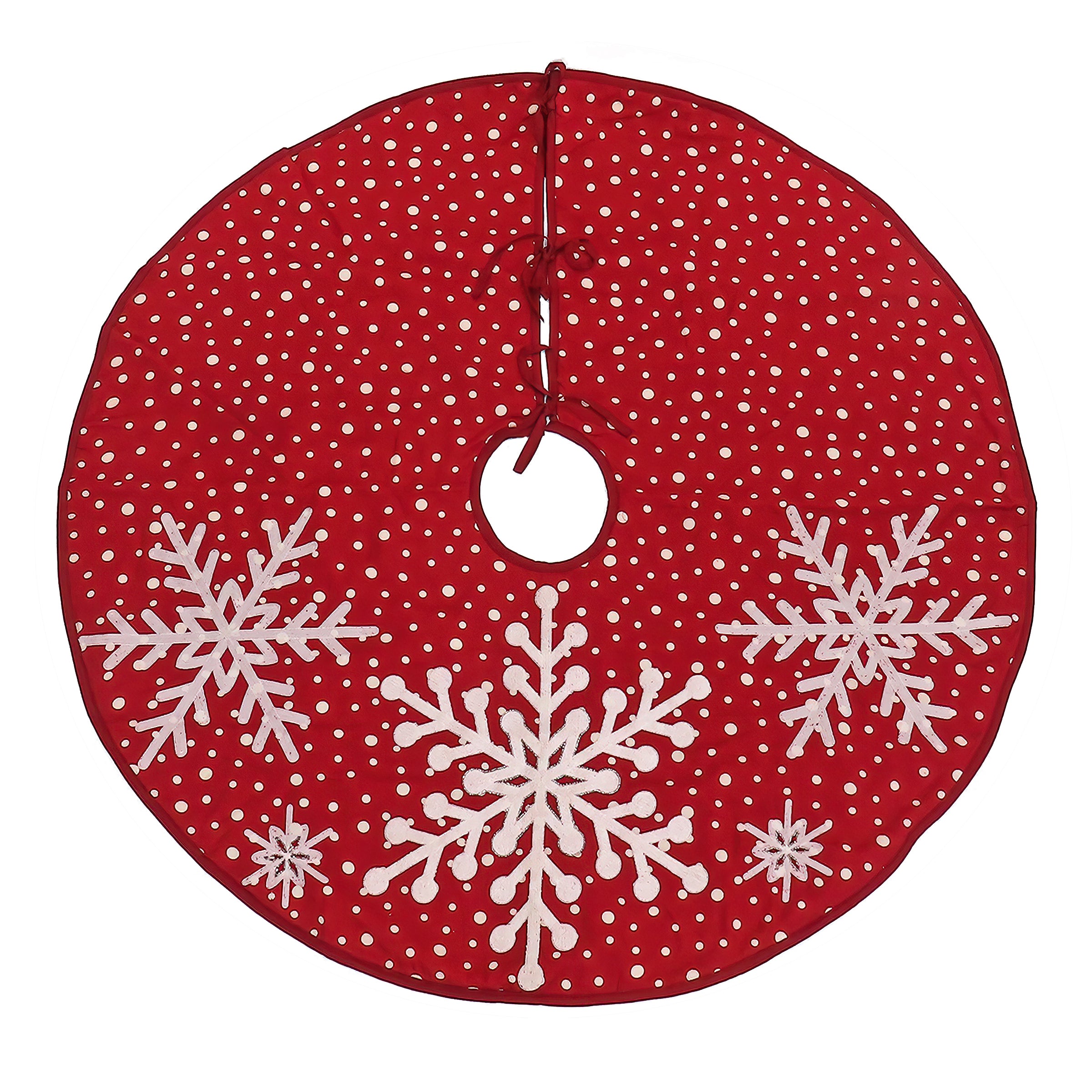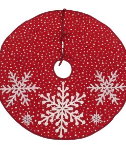 The HGTV Home Collection by National Tree Company 52 inch Red Tree Skirt with Snowflake Embroidery is festive and vibrant! The bright red color is perfect for adding a classic holiday touch. while the snowflake embroidery adds a whimsical and charming detail. The split seam and string ties make it practical for easy setup. This tree skirt would look lovely paired with white or silver ornaments. creating a beautiful winter wonderland effect.