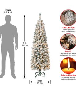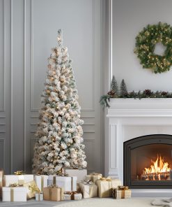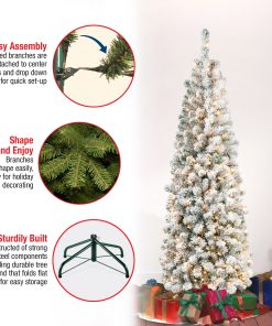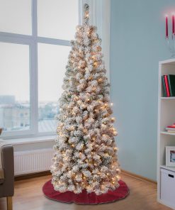 The Acacia tree offers a slim profile tree that is great for display in corners. small rooms and areas with limited space. This tree features flocked branches giving the appearance of freshly fallen snow. It ispre-lit with 250 clear lights that remain lit even if a bulb burns out.This tree features hinged branches for ease of assembly. Sturdy folding metal tree stand is included.