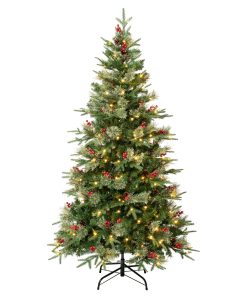 The Virginia Pine tree features Feel Real branch tip technology. creating a tree with remarkable realism. These crush-resistant branch tips are molded from real tree branches for an authentic living tree appearance. Branches are a mixture of evergreen and bristle tips that are trimmed with red berries and pinecones. It is pre-lit with 200 warm white LED lights that are long lasting and energy efficient. Crafted with high quality materials and hinged branches for easy set up and includes a sturdy metal folding stand. For indoor display only.