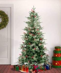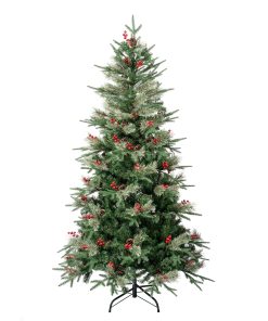 The Virginia Pine tree features Feel Real branch tip technology. creating a tree with remarkable realism. These crush-resistant branch tips are molded from real tree branches for an authentic living tree appearance. Branches are a mixture of evergreen and bristle tips that are trimmed with red berries and pinecones. Crafted with high quality materials and hinged branches for easy set up and includes a sturdy metal folding stand. For indoor display only.