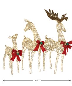 - Includes three champagne glitter Deer family that measures. 60 inches. 52 inches and 36 inches tall. To power the lights. simply plug in to the nearest wall outlet