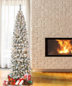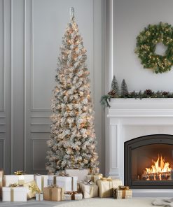 The Acacia tree offers a slim profile tree that is great for display in corners. small rooms and areas with limited space. This tree features flocked branches giving the appearance of freshly fallen snow. It ispre-lit with 350 clear lights that remain lit even if a bulb burns out. This tree features hinged branches for ease of assembly. Sturdy folding metal tree stand is included.