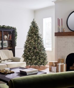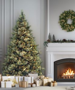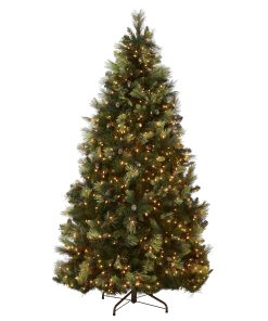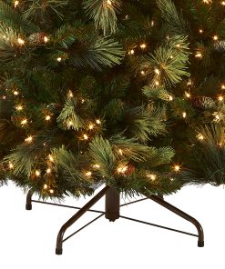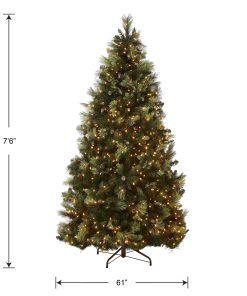This Carolina Pine tree features mixed bristle and cashmere branch tips for an overall softer appearance. It is trimmed with pinecones for added natural appeal and is pre-strung with 1000 clear lights that remain lit even if a bulb burns out. This tree features hinged branch construction for ease of assembly. Sturdy folding metal tree stand is included.