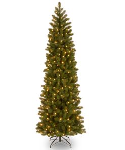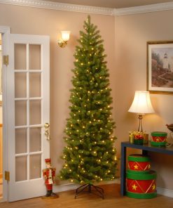 - This Downswept Douglas Fir Slim Pre-Lit Artificial Green Christmas Tree is 7.5 feet tall with a 32 inch base diameter. Featuring hundreds of Feel Real individually crafted branch tips to create full bodied branches. this tree is designed to look and fee
