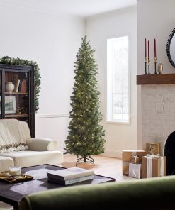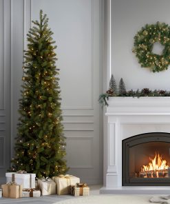 This Downswept Douglas Pencil Slim tree features Feel Real branch tip technology. creating a tree with remarkable realism. These crush-resistant branch tips are molded from real tree branches for an authentic living tree appearance. This slim profile tree. pre-strung with 350 clear lights. is great for display in corners or limited space areas. This tree features hinged branch construction for ease of assembly. Sturdy metal tree stand is included.