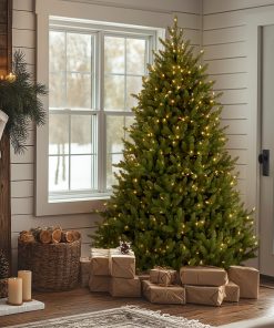 The Natural Fraser Fir features an upswept branch design with a thick. full profile. It is pre-strung with 750 clear lights that remain lit even when a bulb burns out. This tree features hinged branch construction for ease of assembly. Sturdy metal tree stand is included.