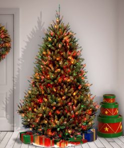 The Natural Fraser Fir features an upswept branch design with a thick. full profile. It is pre-strung with 1000 multicolor lights. 25% more lights than found on similar height trees. This tree features hinged branch construction for ease of assembly. Sturdy metal tree stand is included.