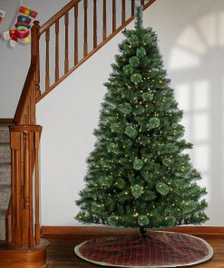 The Ontaria Pine is a mixed branch tree featuring soft. wide bristle tips. It is pre-lit with 600 warm white LED lights that are long lasting and energy efficient. This three-section tree is designed with hinged branches for ease of assembly. Sturdy metal folding stand included. For indoor display only.