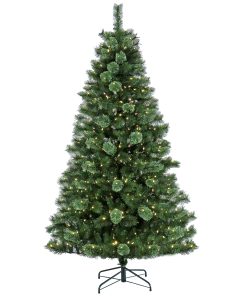 The Ontaria Pine is a mixed branch tree featuring soft. wide bristle tips. It is pre-lit with 600 warm white LED lights that are long lasting and energy efficient. This three-section tree is designed with hinged branches for ease of assembly. Sturdy metal folding stand included. For indoor display only.
