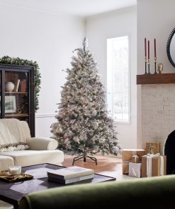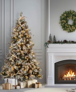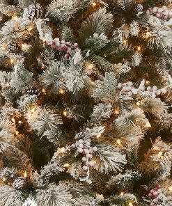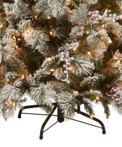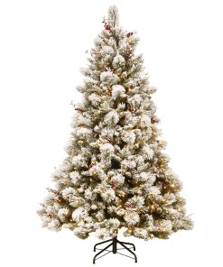This Snowy Bedford Pine is a mixed tip tree with flocked branches giving the appearance of freshly fallen snow. It is pre-strung with 700 clear lights that remain lit even if a bulb burns out. This tree is also trimmed with red berries and pinecones for added natural appeal. This tree features hinged branch construction for ease of assembly. Sturdy metal tree stand is included.