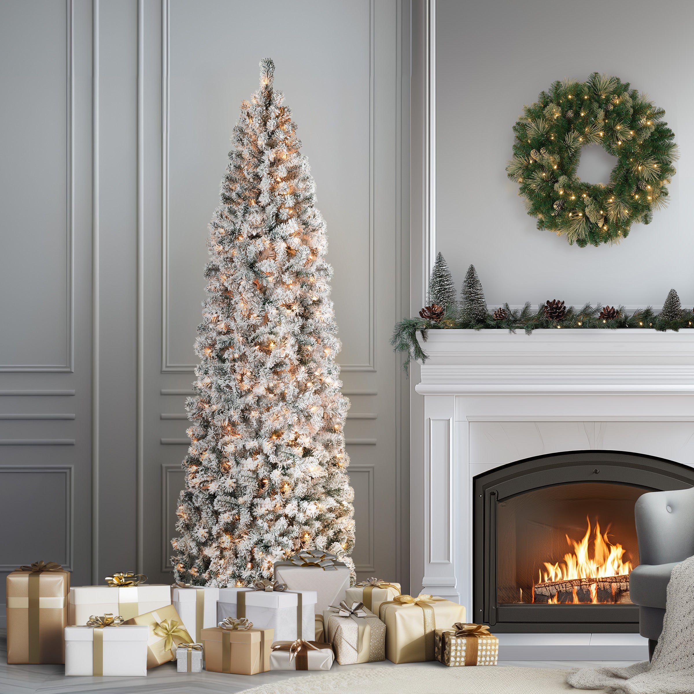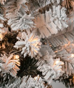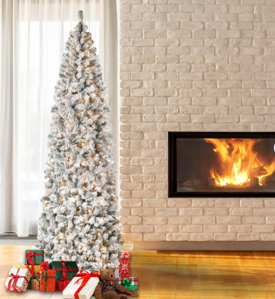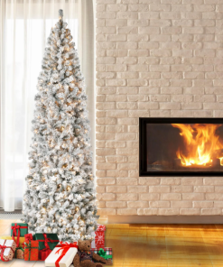 The Acacia tree offers a slim profile that makes it a great choice for display in corners or in areas where floor space is limited. This tree features flocked branches giving the appearance of freshly fallen snow. It is pre-lit with 500 clear lights that remain lit even if a bulb burns out. This tree features hinged branches for ease of assembly. Sturdy folding metal tree stand is included.