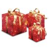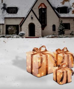 This charming set of white sisal gift boxes includes three sizes. 6 inch. 8 inch. and 10 inch each topped with red checkered bows and gold accents. With 75 clear lights. these decorative boxes create a warm and inviting glow. perfect for enhancing your holiday decor. Ideal for display under the tree. on a mantel. or as part of a festive arrangement. these delightful gift boxes add a whimsical touch of holiday cheer to any space! For indoor or covered outdoor display