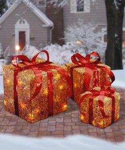 Pre-Lit Gold Gift Box with Red Bow. Set of Three. White Lights
