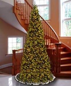 Though tall in height. this Tiffany Fir tree offers a slimmer profile which may make it better for display in corners or areas with limited floor space. compared to typical trees of similar height. It is pre-strung with 800 clear lights that remain lit even if a bulb burns out. This tree features hinged branch construction for ease of assembly. Sturdy metal tree stand is included.