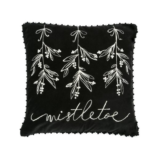 The HGTV Home Collection by National Tree Company 18 inch black velvet pillow with white embroidered mistletoe and the phrase Mistletoe is both elegant and festive! The black velvet adds a luxurious touch. while the white embroidery and mini pom pom trim create a charming contrast. This design is perfect for bringing a sophisticated yet playful vibe to your holiday decor.