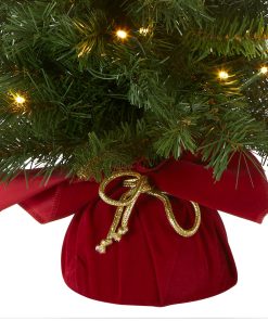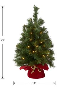 This tabletop tree will add a colorful accent to your holiday decorating scheme. Seated in a gold rope tied red cloth bag. this Majestic Fir is compact and easy to find a place for display. It is pre-strung with 35 battery operated warm white low-voltage LED lights that are energy-efficient. long lasting and cool to the touch. A convenient 6 hours ON/18 hours OFF timer controls light operation.