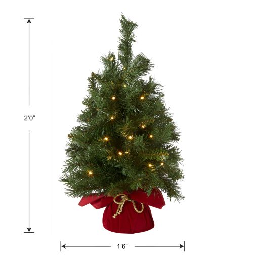This tabletop tree will add a colorful accent to your holiday decorating scheme. Seated in a gold rope tied red cloth bag. this Majestic Fir is compact and easy to find a place for display. It is pre-strung with 35 battery operated warm white low-voltage LED lights that are energy-efficient. long lasting and cool to the touch. A convenient 6 hours ON/18 hours OFF timer controls light operation.