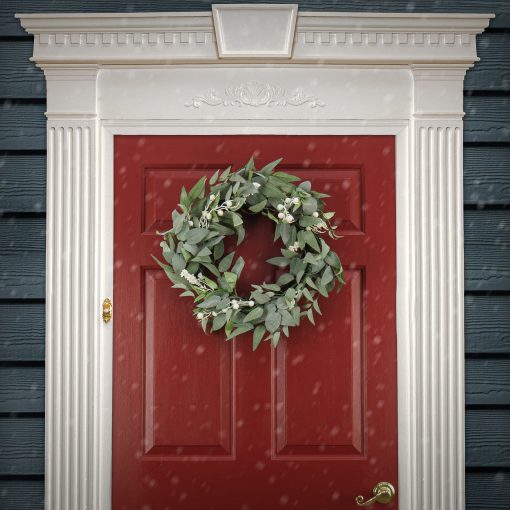 This Mixed Leaves Berry wreath features a swirl of green leaves in assorted shapes and sizes trimmed with snow glittered white berry clusters for added natural appeal. A thick. tightly woven branch ring provides a sturdy base. Display this holiday accented wreath on doors. walls. and windows in indoor or covered outdoor locations.
