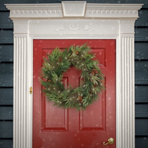 - Suitable as an indoor or covered outdoor decoration. hang this artificial Christmas wreath on a door. window. or mantle to add a natural accent to any area of the house.