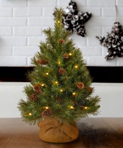 This evergreen tree features mixed branch tips trimmed with pine cones and will look comfortable displayed on floor or tabletop. It is pre-strung with 35 warm white battery operated LED lights that are energy-efficient and long lasting. 6 hours ON/18 hours OFF timed operation. Seated in a burlap bag base for a rustic look. this small and compact tree makes a perfect holiday accent to your seasonal decorating.