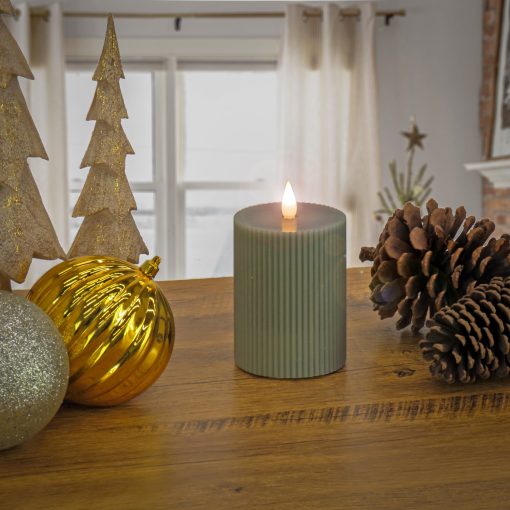 Battery operated with remote controlled functions. this flameless candle produces a realistic. soft. and safe candle glow. The exterior surface is crafted with real wax and features an elegant vertical ridged design in an attractive dark green finish. A handheld remote control operates the lifelike candle flame with functions that include brightness. flicker speed. and timer settings. Uses two C size batteries (not included).